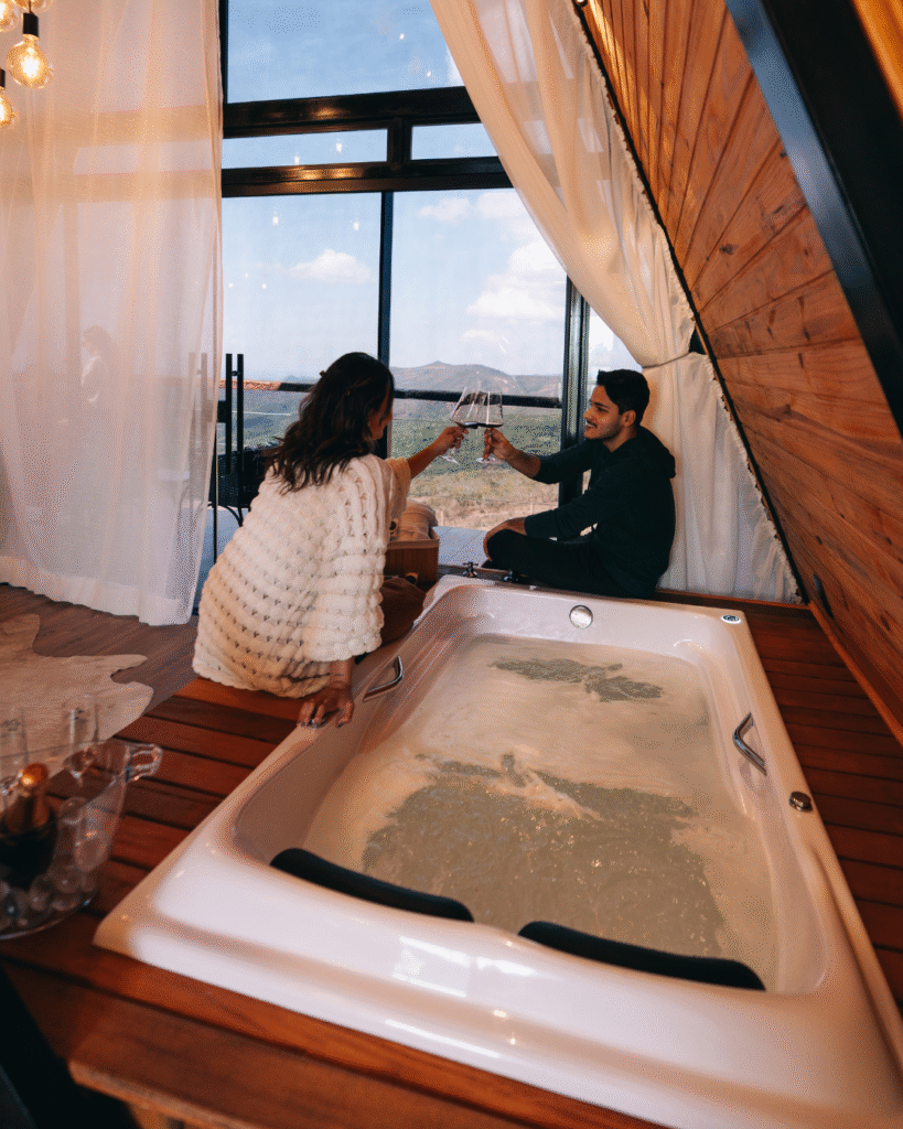 Desfrute de banhos relaxantes em uma banheira de hidromassagem com vista para a paisagem. É o espaço perfeito para recarregar as energias e vivenciar momentos de puro descanso e romance.